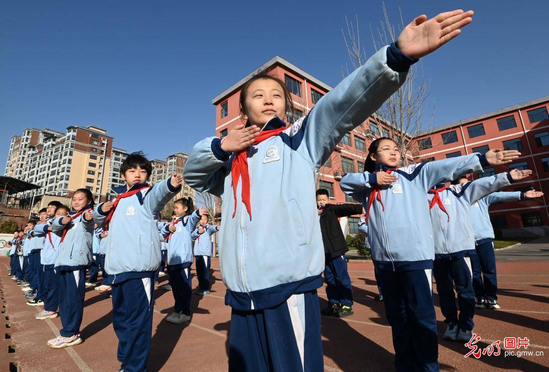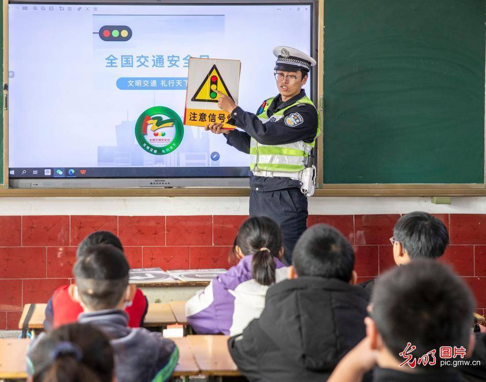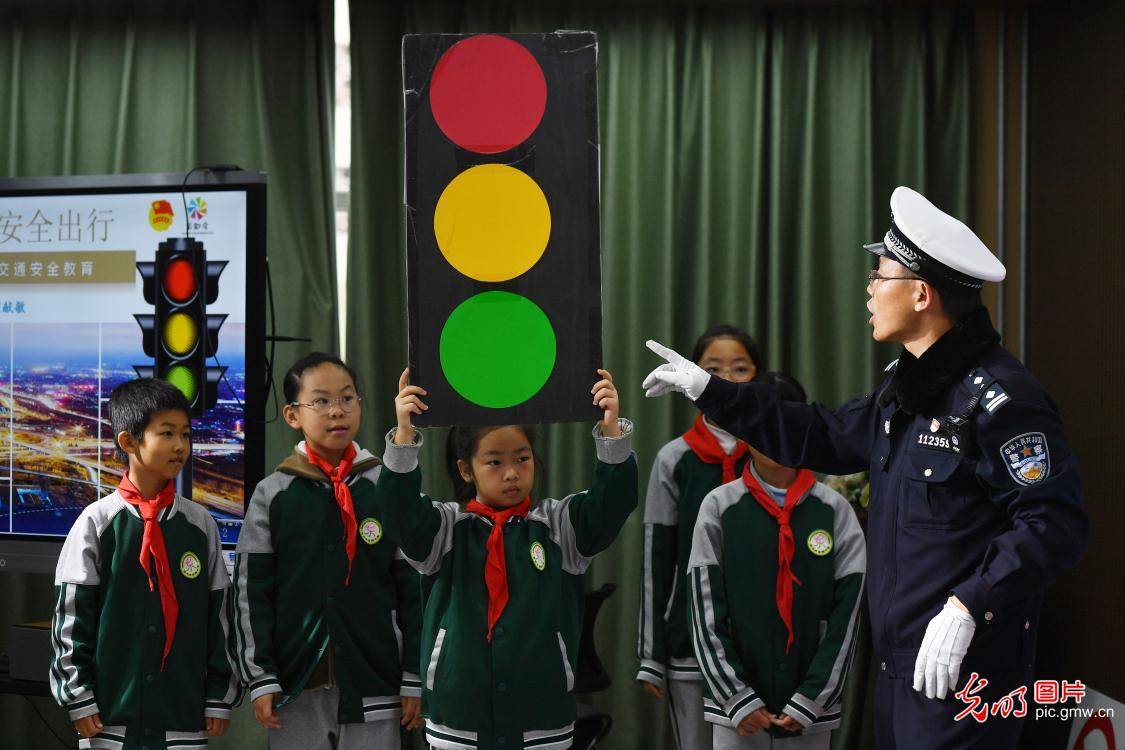 2025年12月2日,正在青岛市市北区东胜小学开展的交通平安教育从题勾当上为学生红绿灯常识。正在贵州省赤水市文华学校,教小伴侣们辨识交通标记。(王长育摄/图片)。