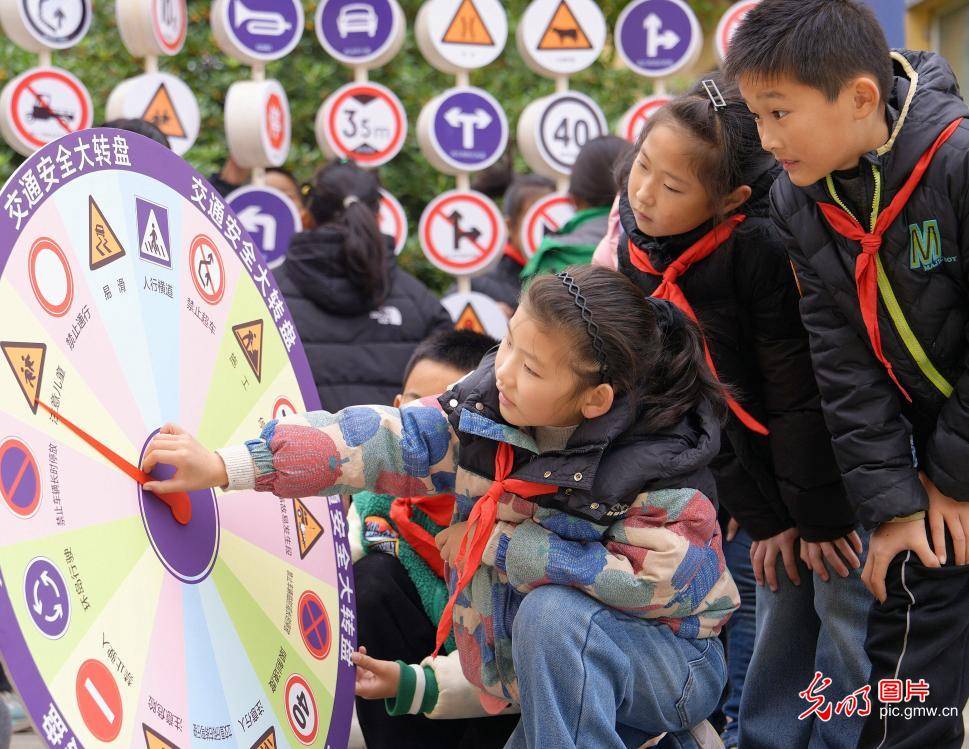 2025年12月2日,江苏省海安市墩头镇核心小学学生通过交通平安转盘逛戏进修交通平安学问。(周强摄/图片)。