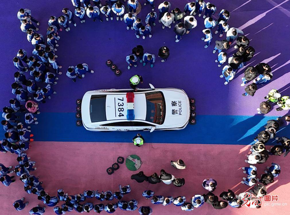 2025年12月2日,省市栾城区第五中学,市栾理大队为学生们若何避开汽车盲区,远离(无人机照片)。(李明发摄/图片)。